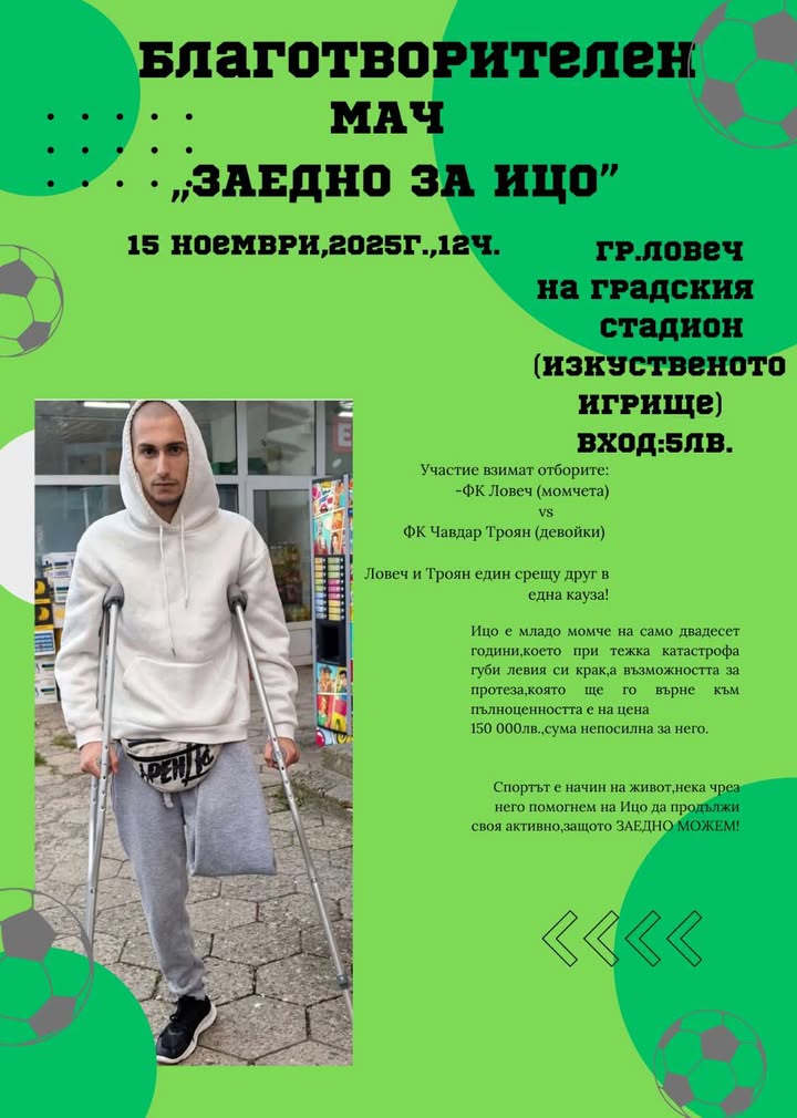 Футболен клуб Ловеч (момчета) и футболен клуб Чавдар Троян (девойки) ще се изправят един срещу друг в благотворителен мач, посветен на каузата в подкрепа на Христофор Райков Христов, който при тежка катастрофа губи левия си крак.