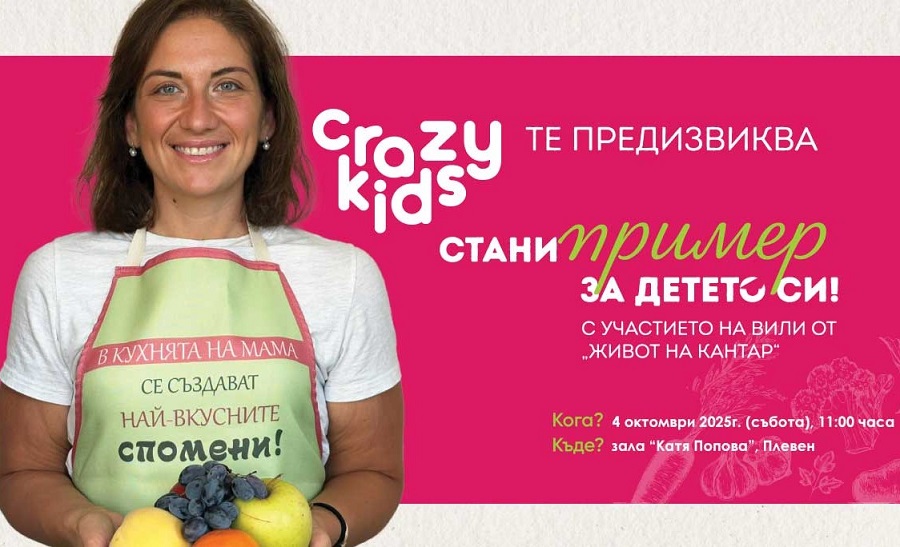 Вдъхновяващо и полезно за деца и родители благотворително събитие под мотото „Стани пример за детето си!“ ще се проведе в Плевен на 4 октомври, събота, от 11.00 часа в зала „Катя Попова“. Инициативата е на „Crazy Kids“ и е подкрепена от Община Плевен. Специални гости ще бъдат: Вили Христова – участник в „Живот на кантар“ и Анна Сапунджиева – победител във формата, Райко Цолов – треньор на деца с наднормено тегло, Ивелина Боиклиева – нутриционист и експерт по балансирано хранене, Веселина Асенова – психолог. Организаторите обещават и много изненади.