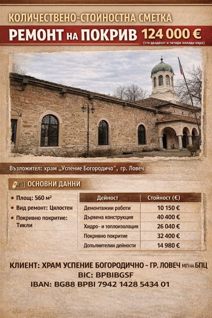 Дарителска инициатива стартира в храм „Успение Богородично“ за осигуряване на средства за спешен ремонт на покрива на сградата, който е в лошо състояние и застрашава съхранението на ценните икони и цялостната конструкция.