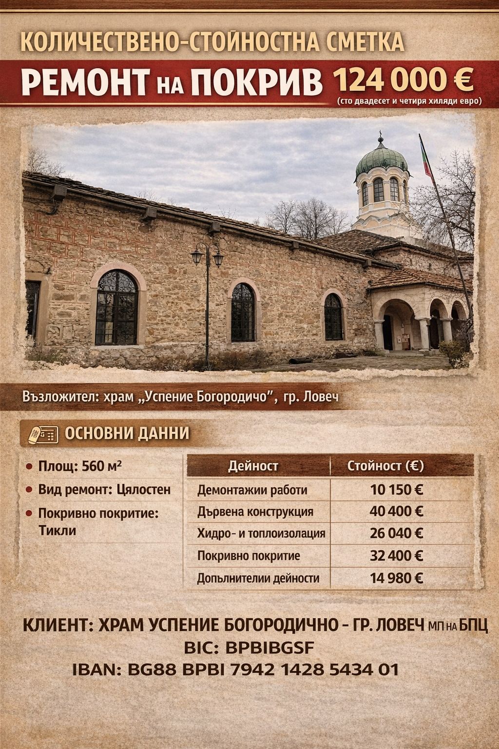 По изготвената количествено-стойностна сметка, общата стойност на ремонта на покрива възлиза на 124 000 евро. Предвидено е да бъдат извършени демонтажни дейности, изграждане на нова дървена конструкция, хидро- и топлоизолация, както и полагане на ново покривно покритие от тикли. Самият покрив е с площ от 560 квадратни метра, като ремонтът е цялостен.