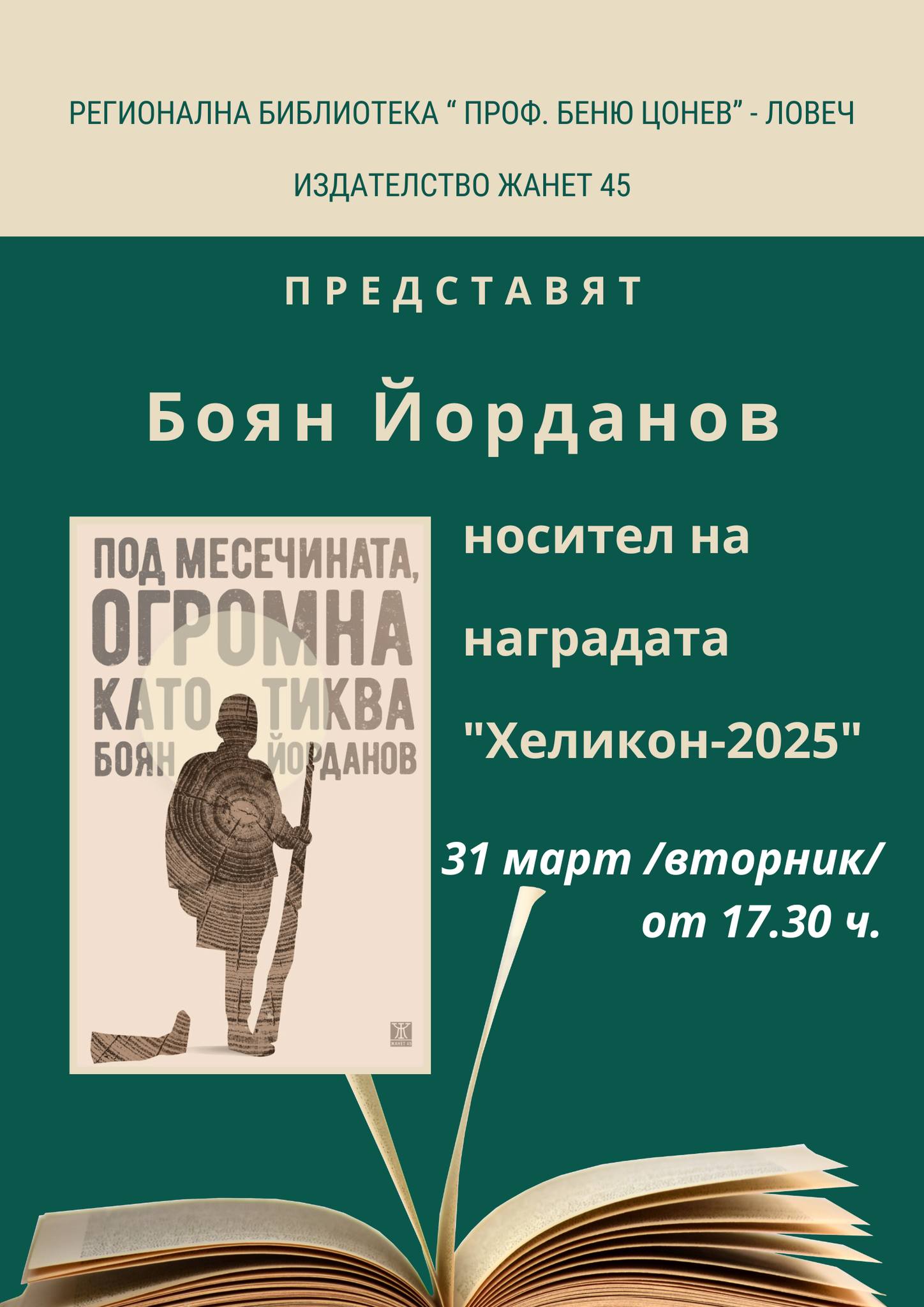Писателят Боян Йорданов ще представи втория си роман „Под месечината, огромна като тиква“ в Регионална библиотека „Проф. Беню Цонев“ в Ловеч. Събитието е организирано съвместно с издателство Жанет 45 и ще се състои на 31 март (вторник) от 17:30 ч.