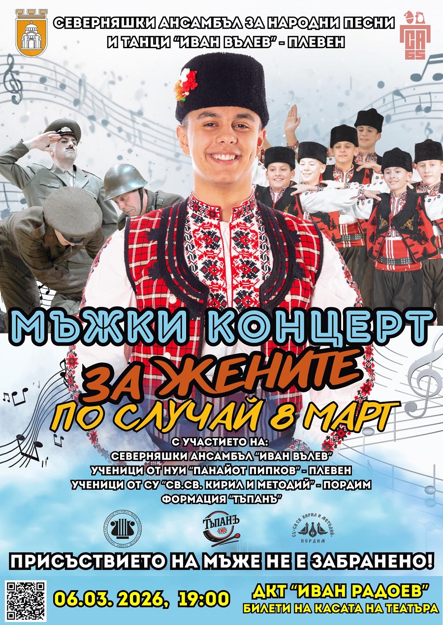 За пета поредна година Северняшкият ансамбъл за народни песни и танци „Иван Вълев” ще зарадва публиката в Плевен с „Мъжки концерт за жените”. Спектакълът е на 6 март (петък) и е посветен на Международния ден на жената. Начало – 19.00 часа, място – сцената на ДКТ „Иван Радоев“ – Плевен. Билети все още могат да бъдат закупени на касата на театъра.