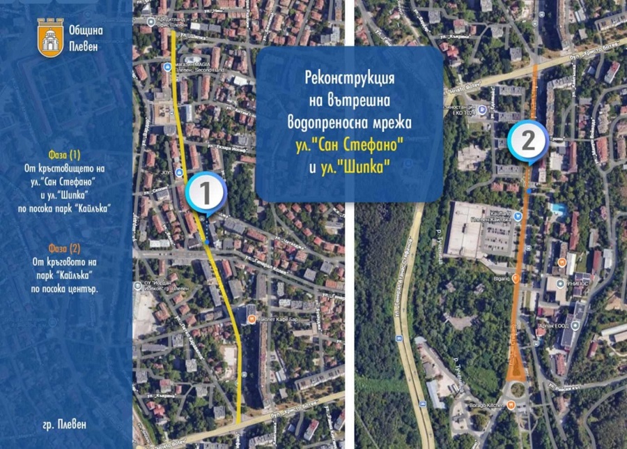 Проектът ще се реализира поетапно при стриктно спазване на технологичната последователност и нормативните изисквания. В първата фаза е предвидена реконструкция на водопреносната мрежа по ул. „Шипка“, като дейностите започват на 16 февруари. Работата ще се извършва на последователни етапи – първо в участъка от кръстовището с ул. „Сан Стефано“ до кръстовището с ул. „Радецки“ с ориентировъчна продължителност от 14 календарни дни. След това ремонтът ще продължи от ул. „Радецки“ до ул. „Шар планина“ за срок от 10 дни, както и от ул. „Шар планина“ до връзката с бул. „Христо Ботев“, също с предвидена продължителност от 10 дни. С напредването на строителните работи ул. „Шипка“ ще бъде поетапно затваряна за движение на моторни превозни средства при въведена временна организация на движението.