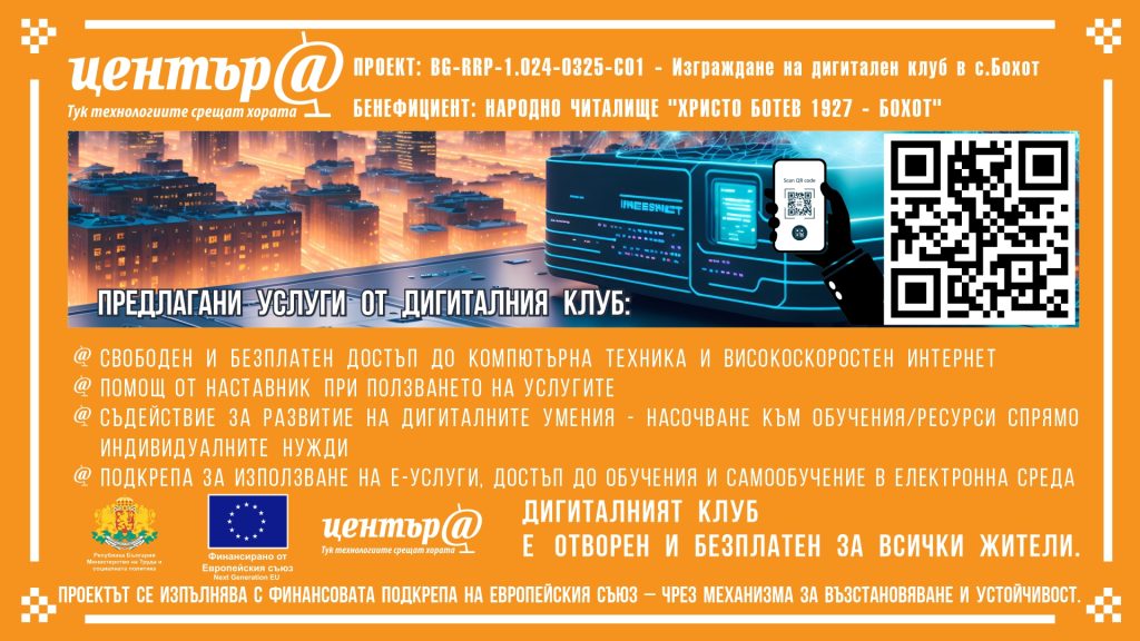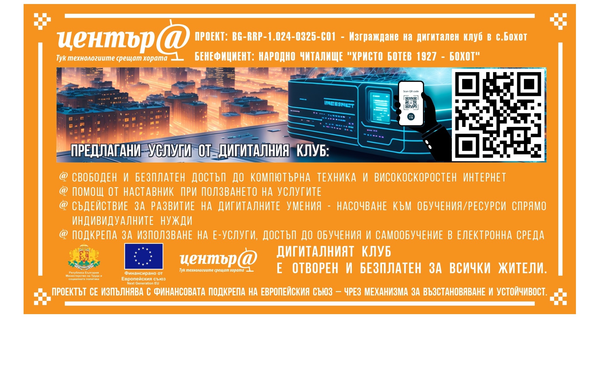 На 5 януари ще отвори врати Дигитален клуб НАРОДНО ЧИТАЛИЩЕ „ХРИСТО БОТЕВ 1927 – БОХОТ“, създаден в рамките на Проект № BG–RRP-1.024-0325-C01.
