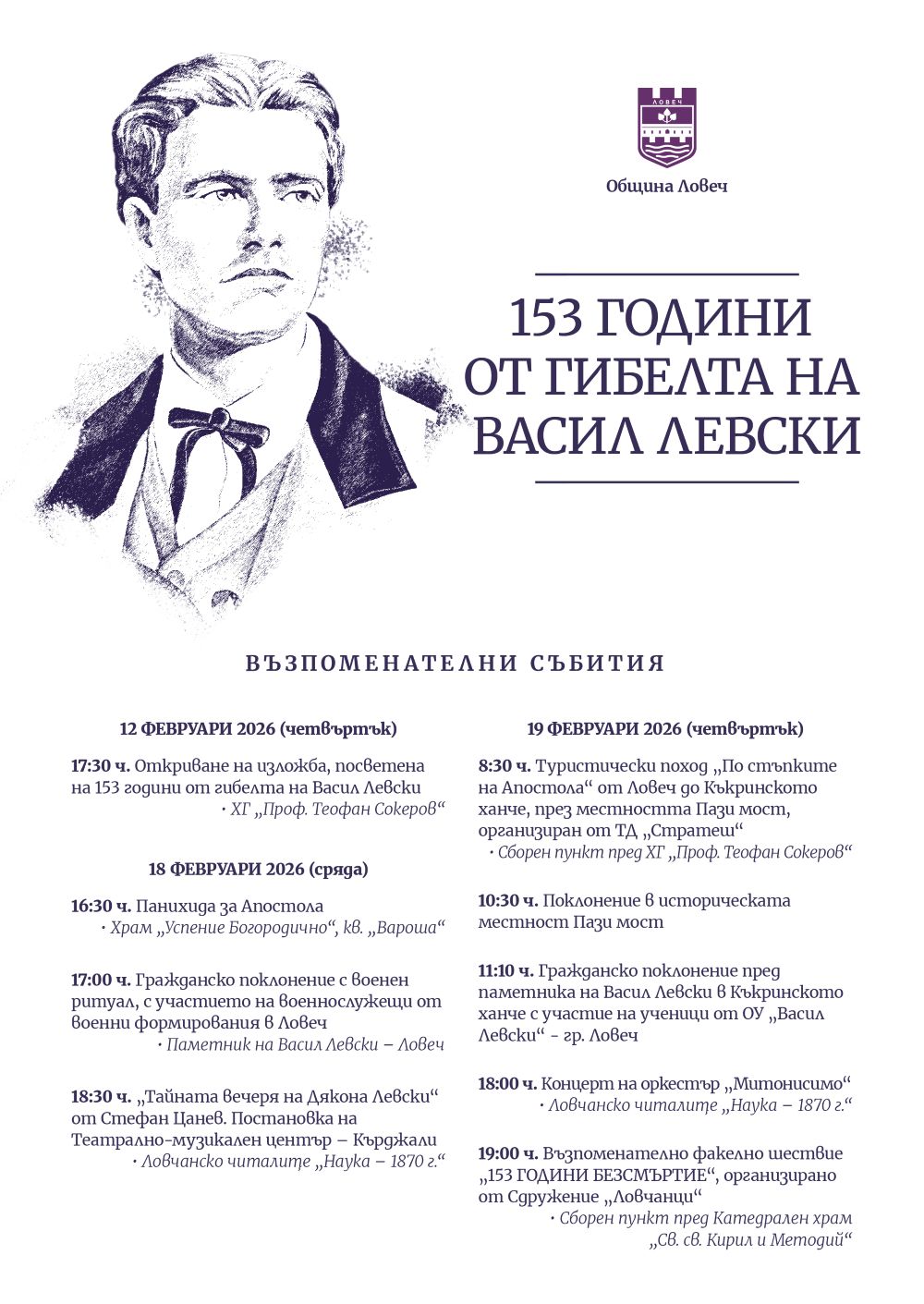 На 18 февруари от 16:30 ч. в храм „Успение Богородично“ в кв. „Вароша“ ще бъде отслужена панихида. В 17:00 ч. пред паметника на Левски в Ловеч ще се състои гражданско поклонение с военен ритуал с участието на военнослужещи от местни формирования.