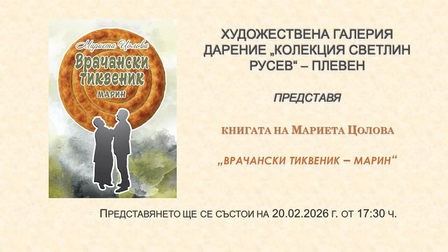 Мариета Цолова ще представи в Плевен второто преработено издание на книгата си „Врачански тиквеник – Марин“. Книгата излиза през 2017 година и предизвиква голям интерес, а тиражът е изкупен за една година. Миналата 2025-а авторката преиздава творбата, но с нови моменти и герои.