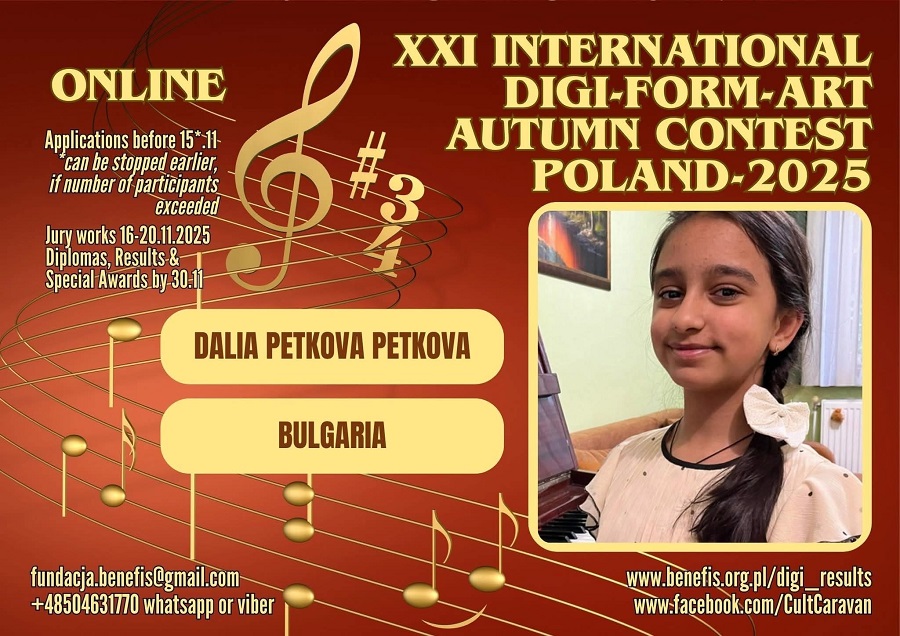 На 25 ноември приключиха престижните XXI Международен конкурс „DIGI – FORM – ART“, проведен в Полша – 2025 г., както и XXI Международен конкурс „Звезден мост – островите по света“, провел се във Френска Полинезия – 2025 г.