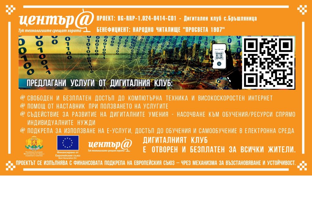На 5 януари ще отвори врати Дигитален клуб Народно читалище „Просвета 1907“-с. Бръшляница, създаден в рамките на Проект № BG-RRP-1.024-0414-C01.