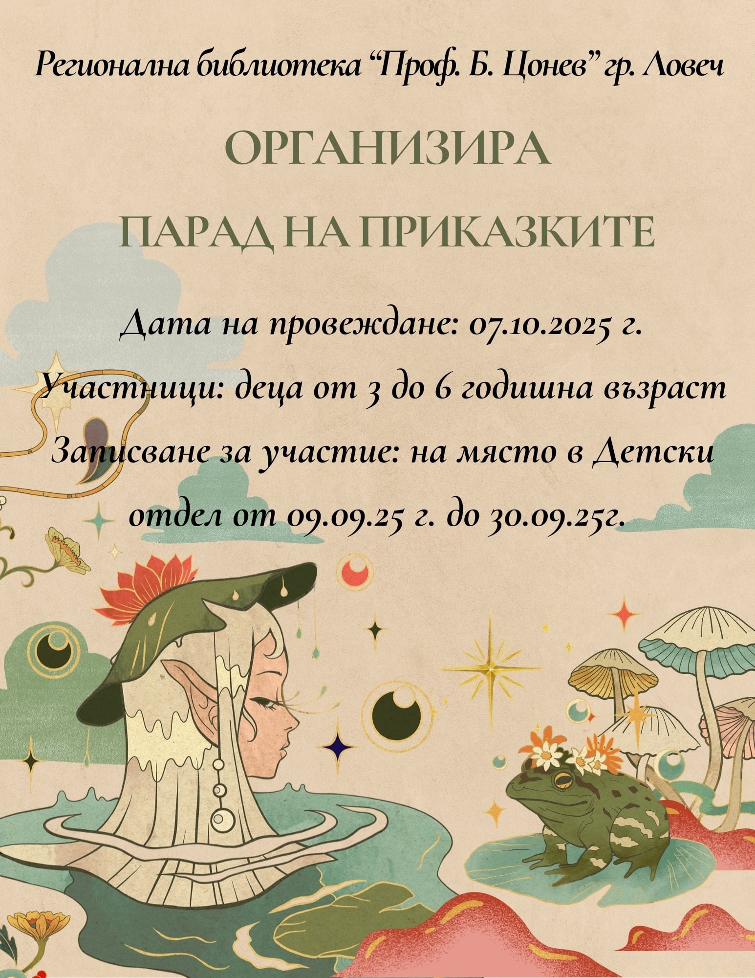 Близо 60 деца ще участват в „Парад на приказките” на 7 октомври в Ловеч. Организатор е регионална библиотека „Проф. Беню Цонев”. Сборният пункт е пред библиотеката, след което в дефиле участниците ще се отправят към Младежкия дом в квартал „Вароша”. На сцената там ще разкажат в какъв приказен герой са се преобразили.